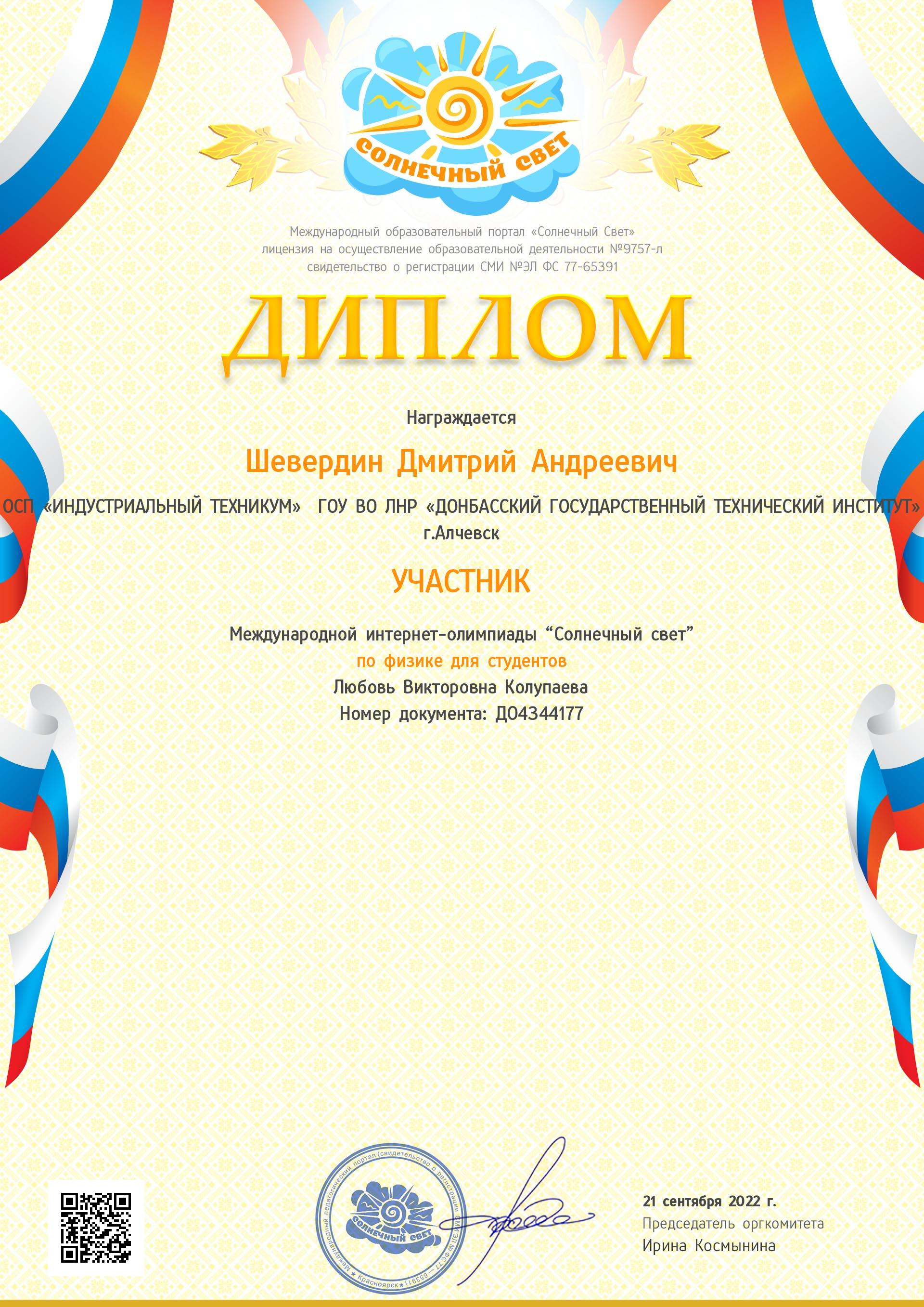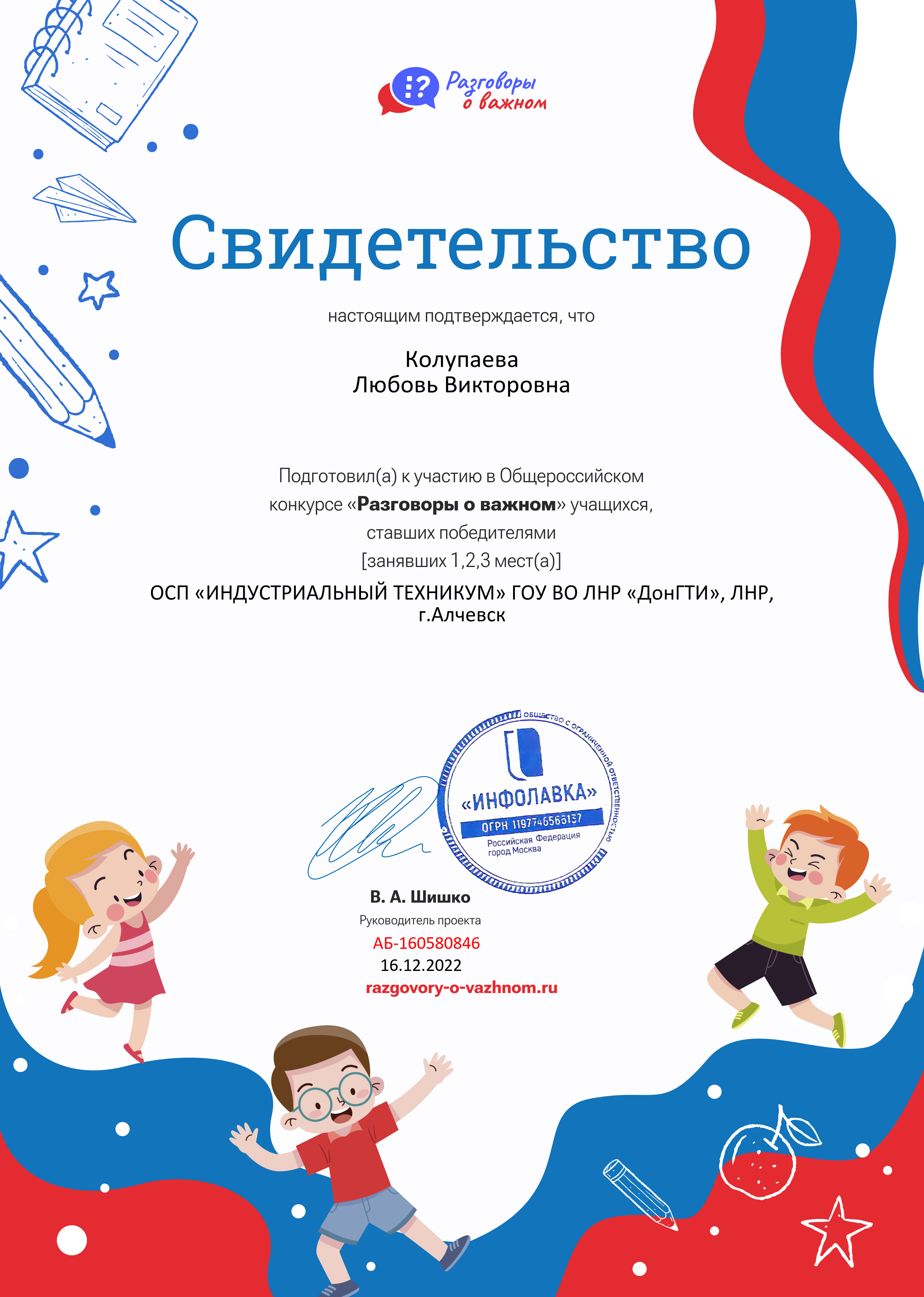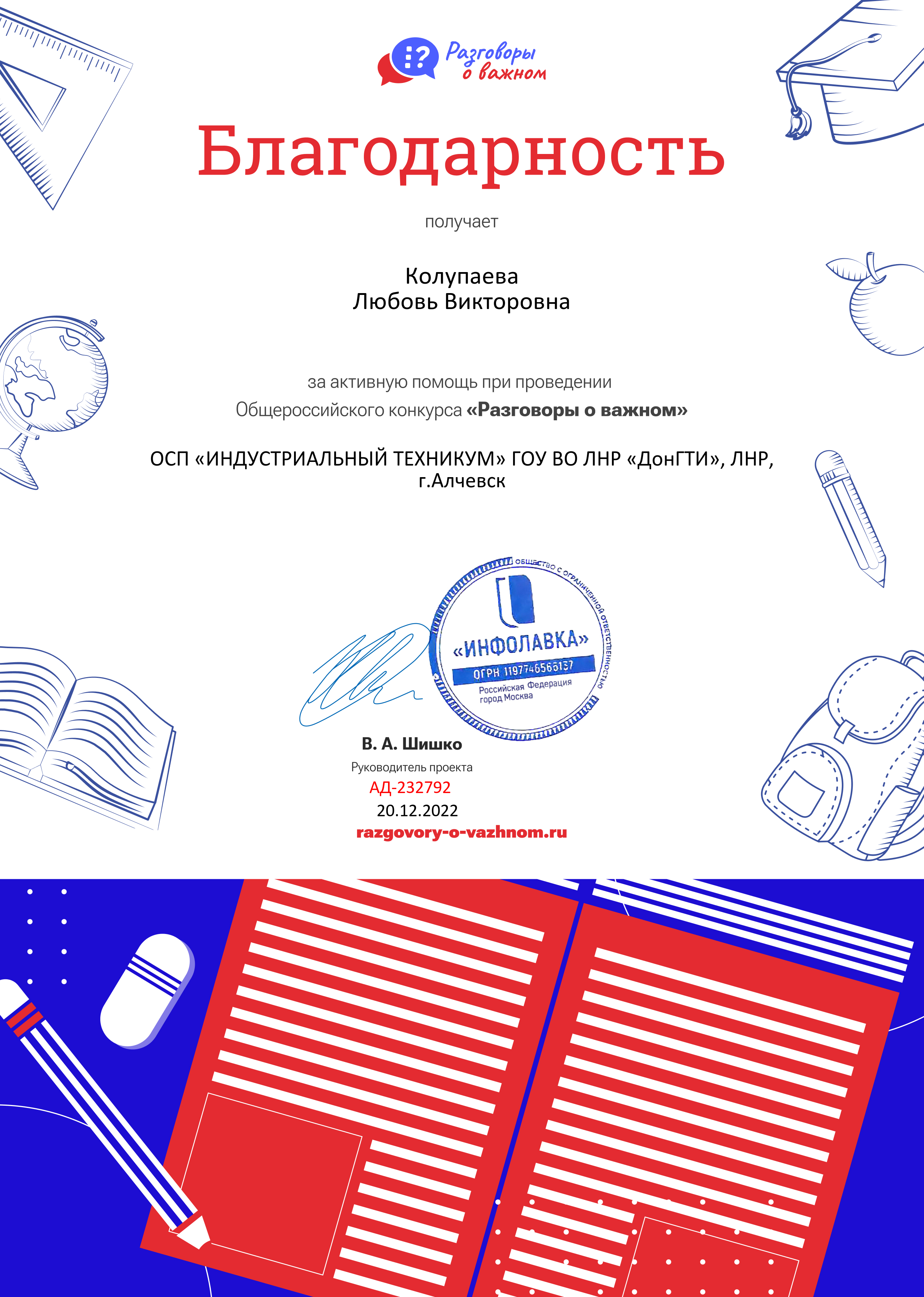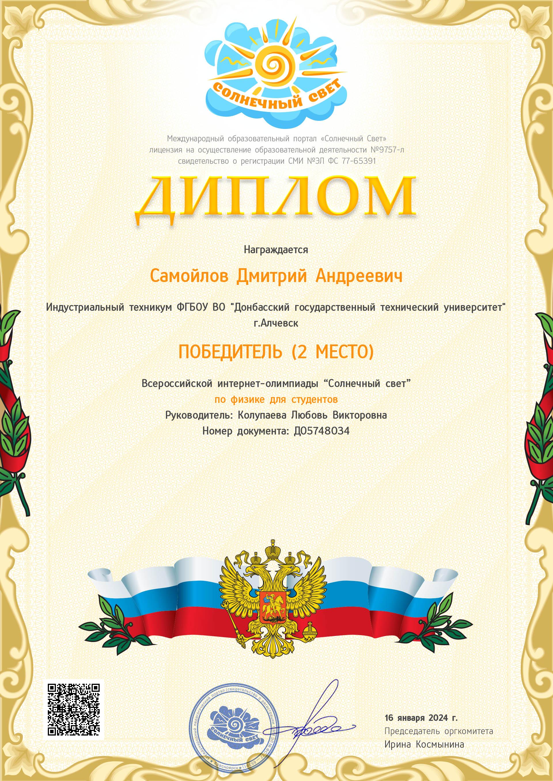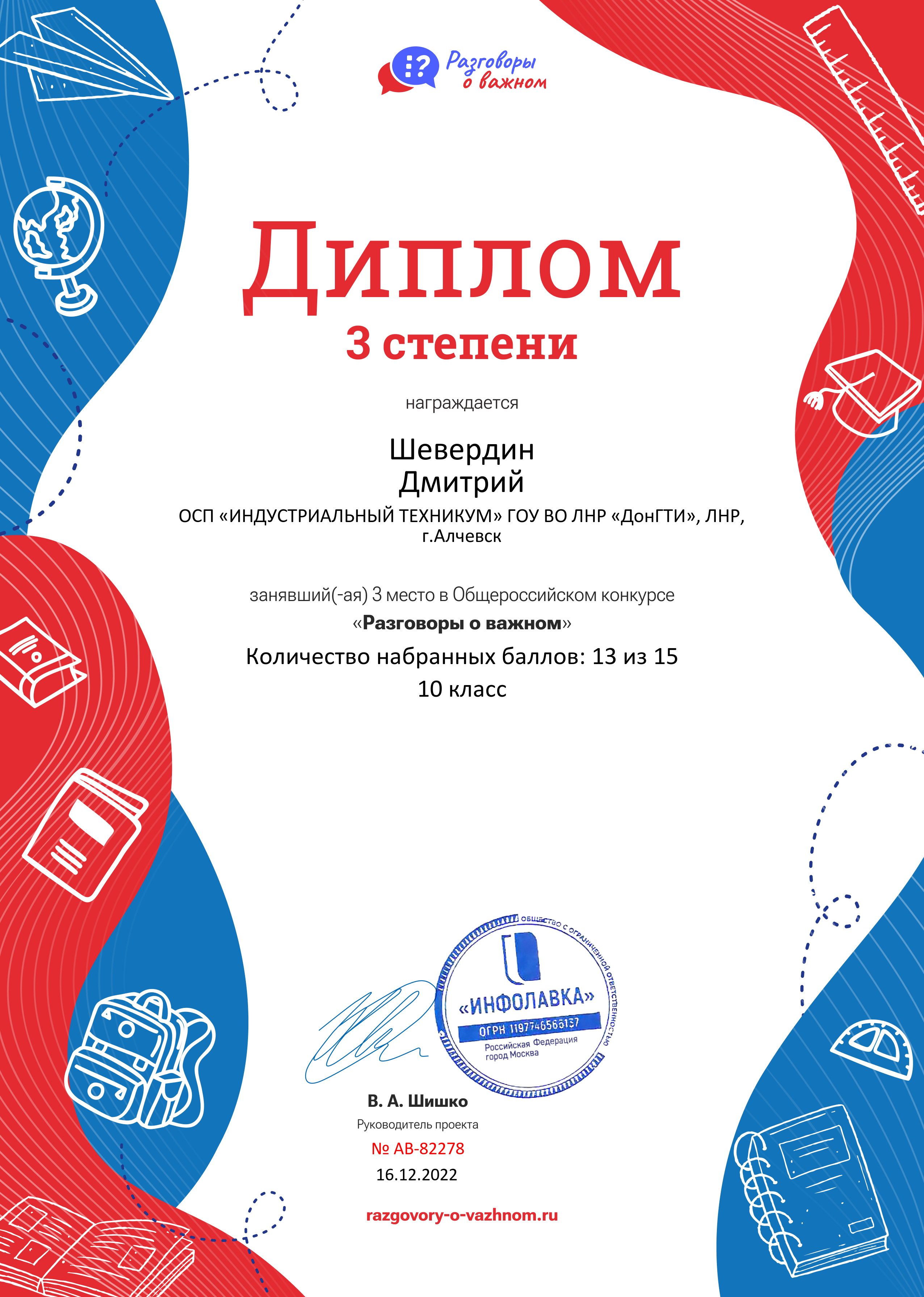 Студенты индустриального техникума приняли участие во Всероссийском физическом диктанте на базе Донбасского государственного технического университета. Прибыльский Илья студент группы ТЭО-2022-1/9 занят III место. |