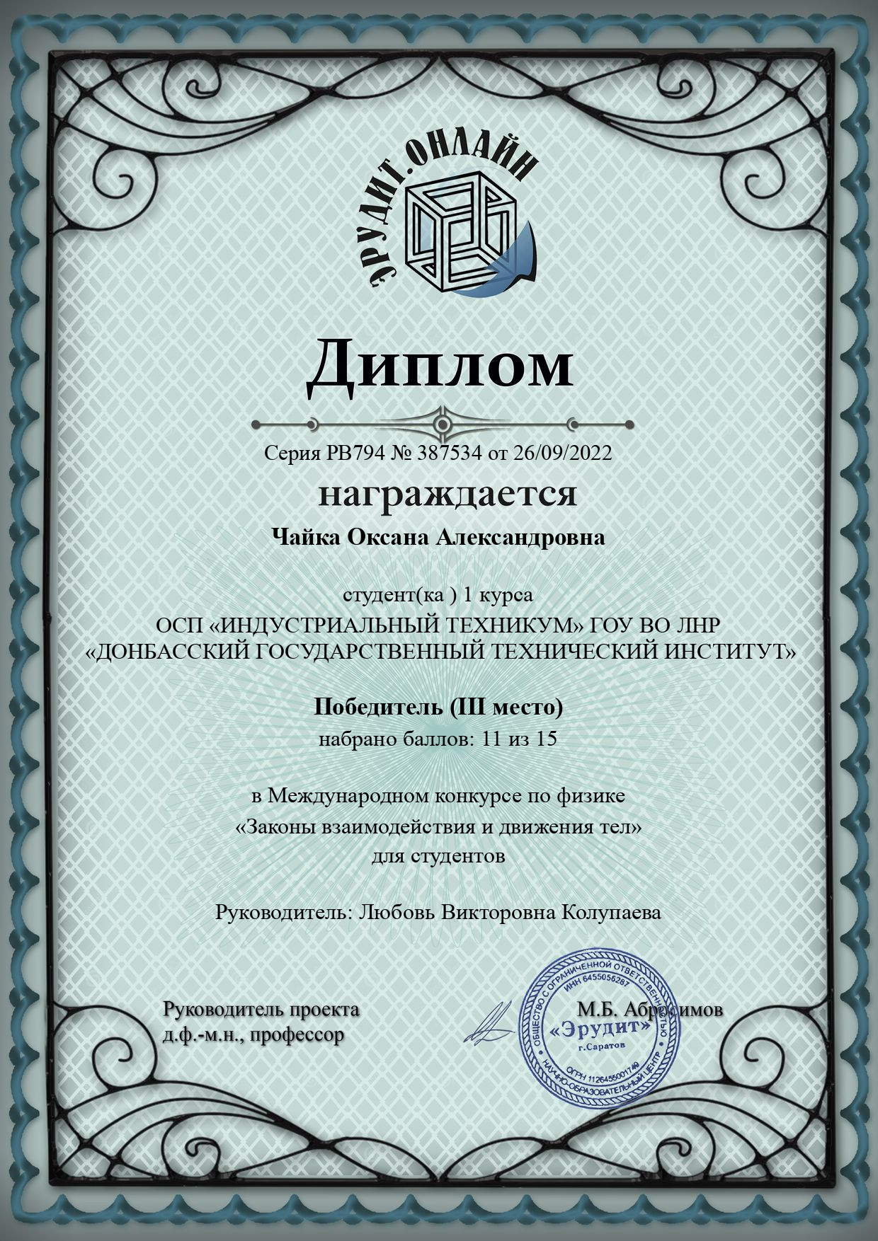 Международный конкурс по физике: «Законы взаимодействия и движения тел» для студентов. Победитель Чайка Оксана, 3 место. |
