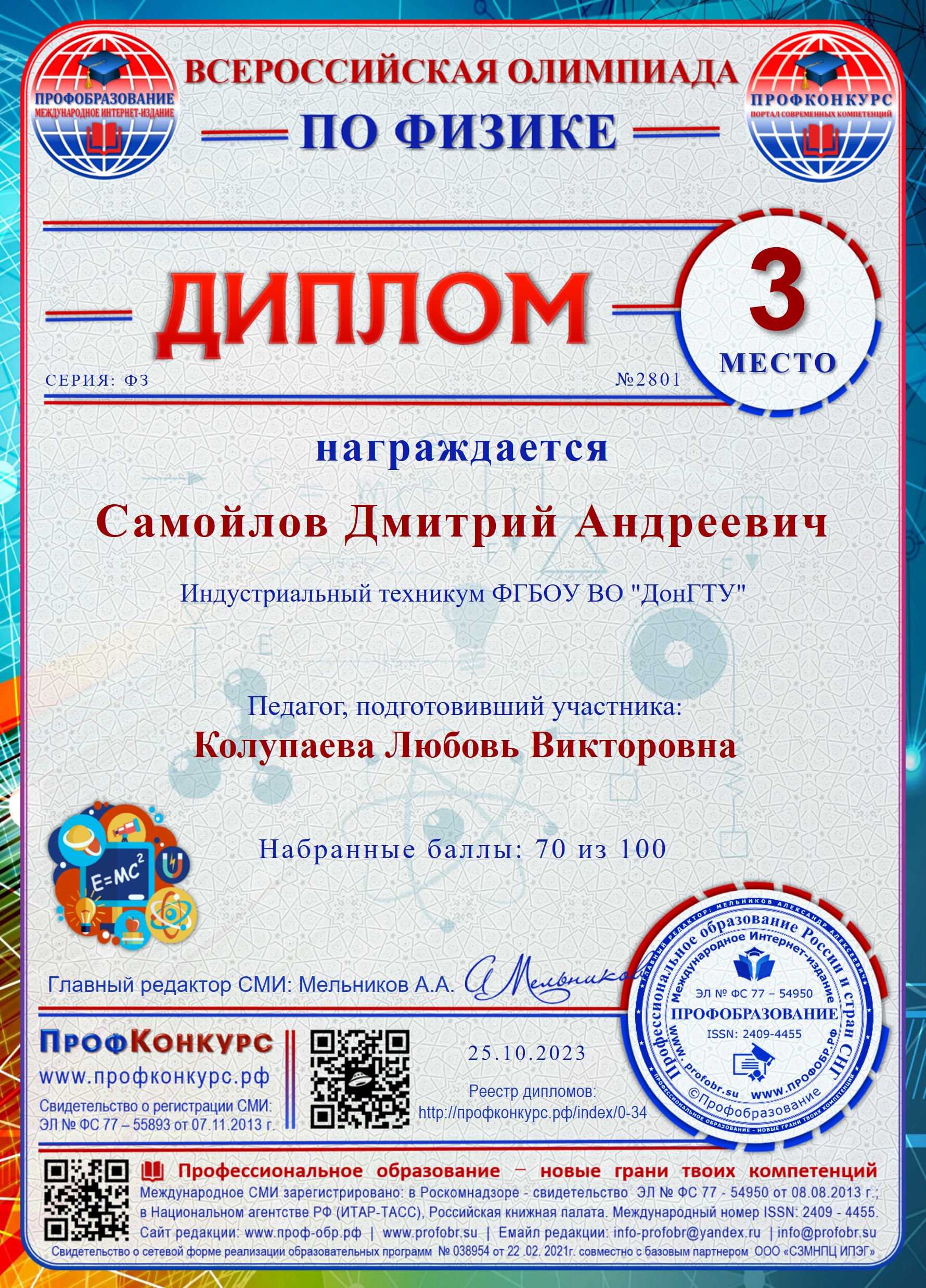 Профобразование. Всероссийская олимпиада по физике. Самойлов Дмитрий 3 место. |