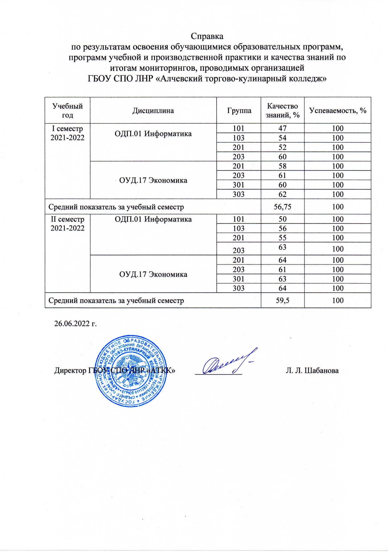 Вывод: Мониторинг учебных достижений обучающихся по дисциплине ОУД.17 Экономика за период с 2021-2022 учебного года позволяет сделать вывод о положительной динамике результатов освоения обучающимися программы дисциплины. Средний показатель качества знаний возрос с 60,25 % (в I семестре 2021-2022 учебного года) до 63 % (во II семестре 2021-2022 учебного года). Абсолютная успеваемость за анализируемый период составила 100%.