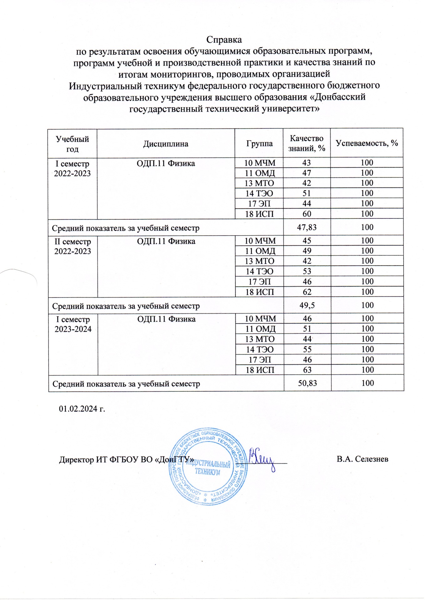 Вывод: Мониторинг учебных достижений обучающихся по дисциплине ОДП.11 Физика за период 2022-2023 и 2023-2024 учебных годов позволяет сделать вывод о положительной динамике результатов освоения обучающимися программы дисциплины. Средний показатель качества знаний возрос с 47,83 % (в I семестре 2022-2023 учебного года) до 50,83 % (в I семестре 2023-2024 учебного года). Абсолютная успеваемость за анализируемый период составила 100%.
